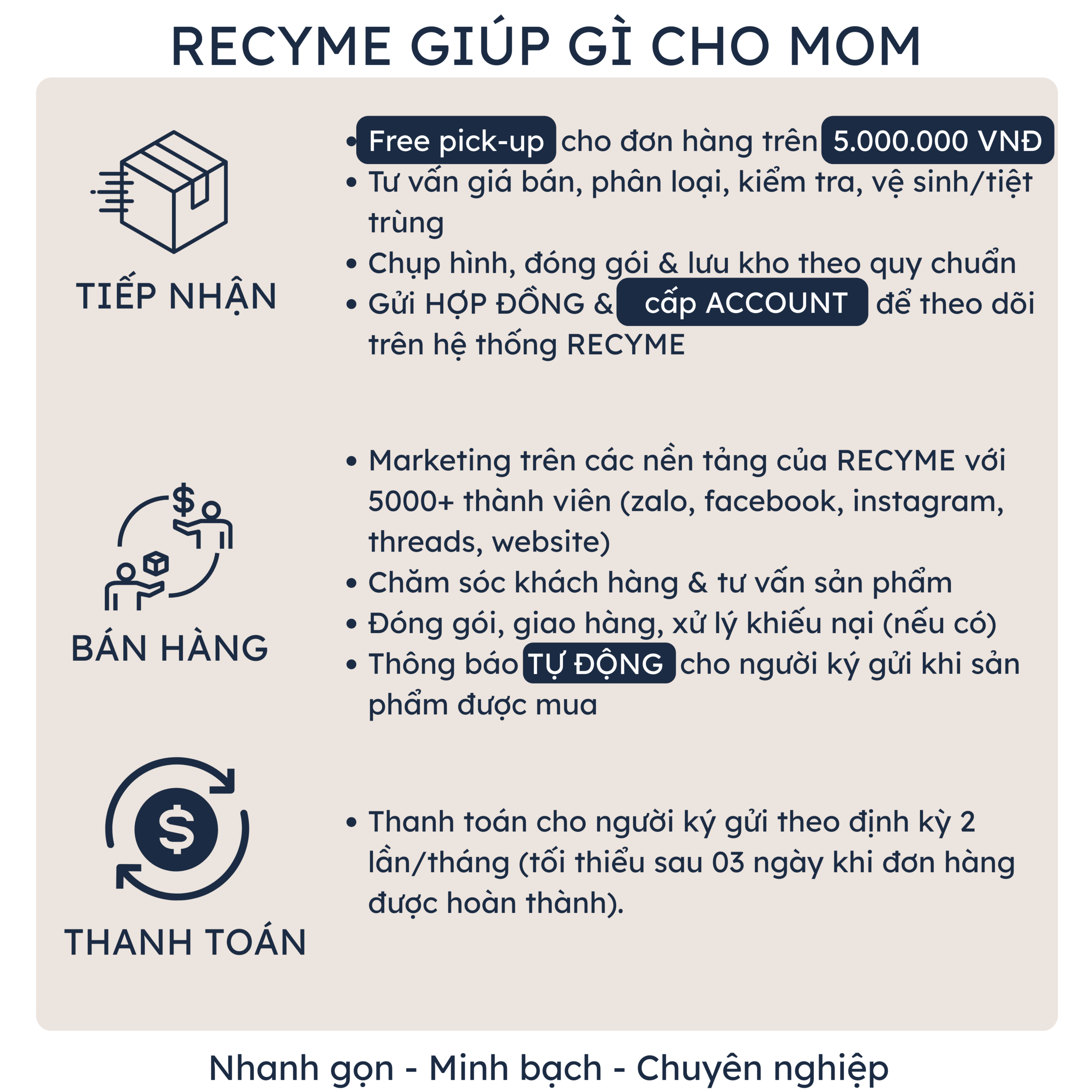 Recyme sẽ chuyển khoản tiền bán được sau khi thanh lý sản phẩm cho Mom