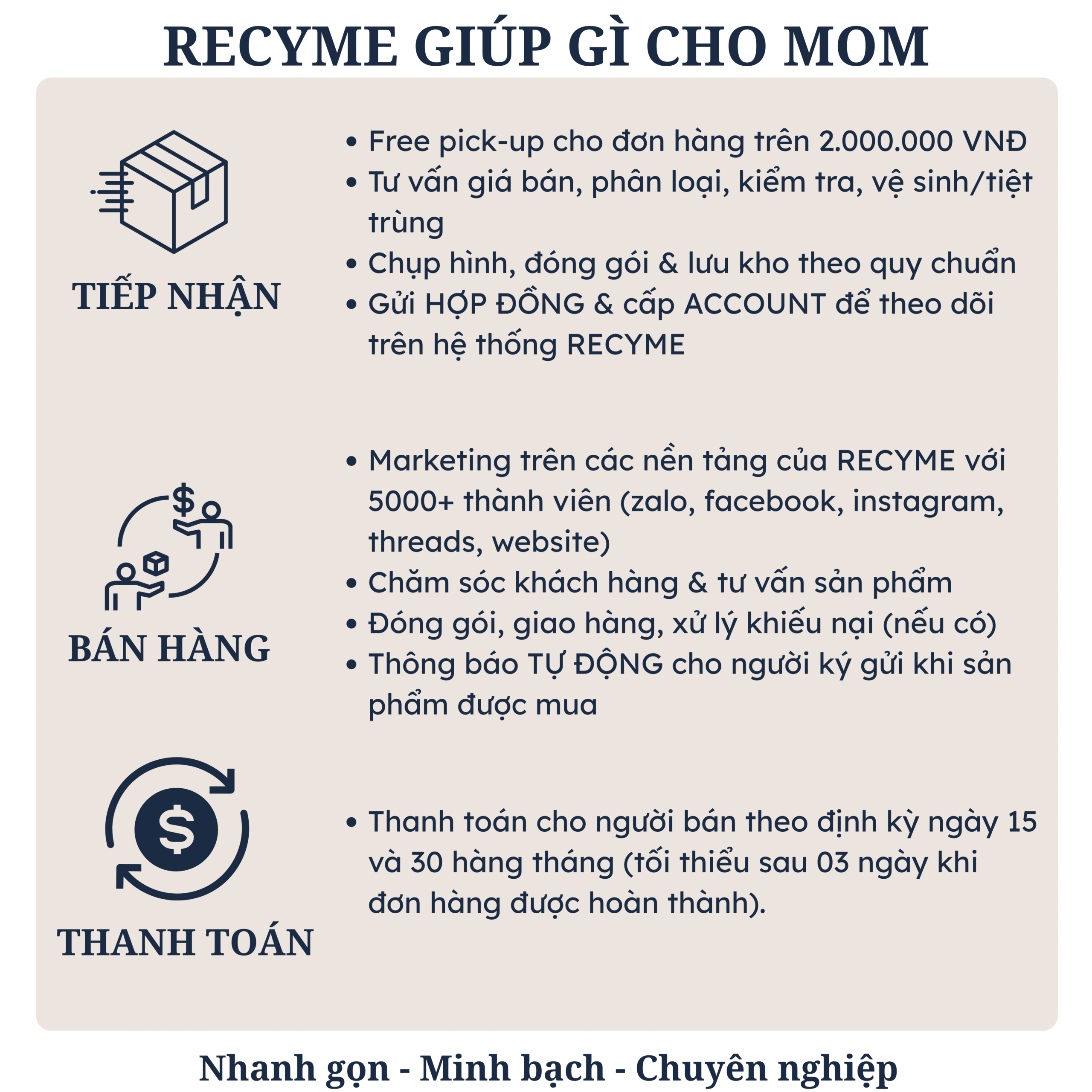 Mom hiện có đang sinh sống ở TP. Hồ Chí Minh hay không? *CóKhôngRất tiếc, hiện tại Recyme chỉ mới phục vụ ở khu vực TP.HCM. Hẹn sớm gặp lại các Mom trên khắp cả nước nhé ạ! Mom có thể tiếp tục shopping tại web nhà em (Săn deal nhanh nhất tại -> nhấn vào chữ: GROUP ZALO) Tổng giá trị ký gửi sản phẩm trên 2.000.000 VNĐ *CóKhôngRất tiếc, hiện tại Recyme chỉ nhận các đơn hàng có giá trị ký gửi trên 2.000.000 VNĐ. Hi vọng tui mình sẽ sớm mở rộng để phục vụ thêm các đơn hàng nhỏ hơn hoặc mom đợi bé lớn hơn để gửi thêm hàng cho Recyme nhé! Mom có thể tiếp tục shopping tại web nhà em (Săn deal nhanh nhất tại -> nhấn vào chữ: GROUP ZALO) Recyme hiện nhận ký gửi các sản phẩm mẹ và bé: Có thương hiệu cao cấp (đạt chuẩn an toàn và chính hãng). Có độ mới trên 80% *Đáp ứng cả 2 tiêu chí trênKhông thuộc 2 tiêu chí trênVí dụ: Nuna, Yoyo, Cybex, Hegen, Dono Dono, Baby Bjorn, Philips Avent, Dr. Browns, Ergo,...Mom có thể liên hệ Recyme qua số hotline 0334417889 hoặc Zalo OA Mom có thể tiếp tục shopping tại web nhà em (Săn deal nhanh nhất tại -> nhấn vào chữ: GROUP ZALO) Cảm ơn các mom đã quan tâm đến dịch vụ ký gửi của Recyme. Tuy nhiên, sản phẩm hiện chưa phù hợp với tiêu chí của chúng tôi. Recyme hiện hướng đến cung cấp các sản phẩm cao cấp, an toàn cho bé, giúp các mom tiết kiệm hơn trong dài hạn khi tái sử dụng và trao lại sản phẩm tốt được nhiều lần cho các pé iu khác. Hy vọng sẽ sớm gặp lại mom ah! Thương mến,Đội ngũ Recyme Mom có thể tiếp tục shopping tại web nhà em (Săn deal nhanh nhất tại -> nhấn vào chữ: GROUP ZALO)Tôi đã đọc kỹ nội dung. *Đồng ýPhí ký gửi/sản phẩmMức phí có thể linh hoạt điều chỉnh tùy vào độ thanh khoản thực tế của sản phẩm tại từng thời điểm.KOL và KOC, để nhận thông tin chi tiết về chính sách ưu đãi, xin vui lòng liên hệ với Recyme. Chính sách nếu sản phẩm chưa bán được:– Sau 30 ngày: Mom có thể chọn giảm giá 20% hoặc giữ nguyên giá bán hoặc gửi trả lại (Mom chịu phí ship).– Sau 120 ngày: Sản phẩm có thể được chuyển sang các mục đồng giá (50k–200k,...) hoặc donate, hoặc gửi trả lại (Mom chịu phí ship).Tôi đã đọc và đồng ý với chính sách ký gửi và chính sách bán hàng. *Đồng ýSố lượng sản phẩm ký gửi *Chọn số lượng1-5 sản phẩm5-10 sản phẩm10-20 sản phẩmTrên 20 sản phẩmChụp ảnh hoặc điền thông tin sản phẩm (Nếu số lượng nhiều chỉ cần liệt kê những sản phẩm ƯU TIÊN muốn bán) *Chọn lựa cách thức tiện lợi và nhanh chóng nhấtĐiền thông tin sản phẩm (Phù hợp < 10 sản phẩm)Chụp ảnh riêng hoặc chung tất cả sản phẩm (Phù hợp >10 sản phẩm)Hình ảnh sản phẩm (chụp toàn bộ sản phẩm cần ký gửi - có thể trong 1 bức ảnh) *Kéo và thả (hoặc) Chọn tệpMom muốn định giá sản phẩm như thế nào? *Mom tự định giáRecyme định giá giúpChọn 1 trong 2 cách định giá phù hợp với mom.Mức giá Mom muốn bán cho sản phẩm (trước khi trừ phí hoa hồng Recyme) *Thông tin và tình trạng sản phẩmNêu thông tin sản phẩm chính, các sản phẩm khác như quần áo, giày dép có thể để vào cùng 1 dòngSản phẩm 1: Tên sản phẩm + Thương hiệu + Model sản phẩm *(Bắt buộc điền đủ 3 trường thông tin)Độ mới *Mới 100% (Hoàn toàn mới, chưa qua sử dụng, còn hộp và đầy đủ phụ kiện)Như mới >90% (Gần như mới, ít hoặc nhìn như không có dấu hiệu sử dụng)Dùng kỹ 80%-90% (Đã qua sử dụng, có một số dấu hiệu nhưng vẫn hoạt động tốt, còn nhiều giá trị sử dụng)Tình trạng (có thể chọn nhiều mục)Còn billCòn box hãngCòn bảo hànhNếu không có bỏ qua.Mom muốn định giá sản phẩm như thế nào?Mom tự định giáRecyme định giá giúpChọn 1 trong 2 cách định giá phù hợp với mom.Mức giá Mom muốn bán cho sản phẩm (trước khi trừ phí hoa hồng Recyme)Mom có thể thêm dòng mới cho sản phẩm tiếp theoSản phẩm 2: Tên sản phẩm + Thương hiệu + Model sản phẩm(Bắt buộc điền đủ 3 trường thông tin)Độ mớiMới 100% (Hoàn toàn mới, chưa qua sử dụng, còn hộp và đầy đủ phụ kiện)Như mới >90% (Gần như mới, ít hoặc nhìn như không có dấu hiệu sử dụng)Dùng kỹ 80%-90% (Đã qua sử dụng, có một số dấu hiệu nhưng vẫn hoạt động tốt, còn nhiều giá trị sử dụng)Tình trạng (có thể chọn nhiều mục)Còn billCòn box hãngCòn bảo hànhNếu không có bỏ qua.Mom muốn định giá sản phẩm như thế nào?Mom tự định giáRecyme định giá giúpChọn 1 trong 2 cách định giá phù hợp với mom.Mức giá Mom muốn bán cho sản phẩm (trước khi trừ phí hoa hồng Recyme)Mom có thể thêm dòng mới cho sản phẩm tiếp theoSản phẩm 3: Tên sản phẩm + Thương hiệu + Model sản phẩm(Bắt buộc điền đủ 3 trường thông tin)Độ mớiMới 100% (Hoàn toàn mới, chưa qua sử dụng, còn hộp và đầy đủ phụ kiện)Như mới >90% (Gần như mới, ít hoặc nhìn như không có dấu hiệu sử dụng)Dùng kỹ 80%-90% (Đã qua sử dụng, có một số dấu hiệu nhưng vẫn hoạt động tốt, còn nhiều giá trị sử dụng)Tình trạng (có thể c