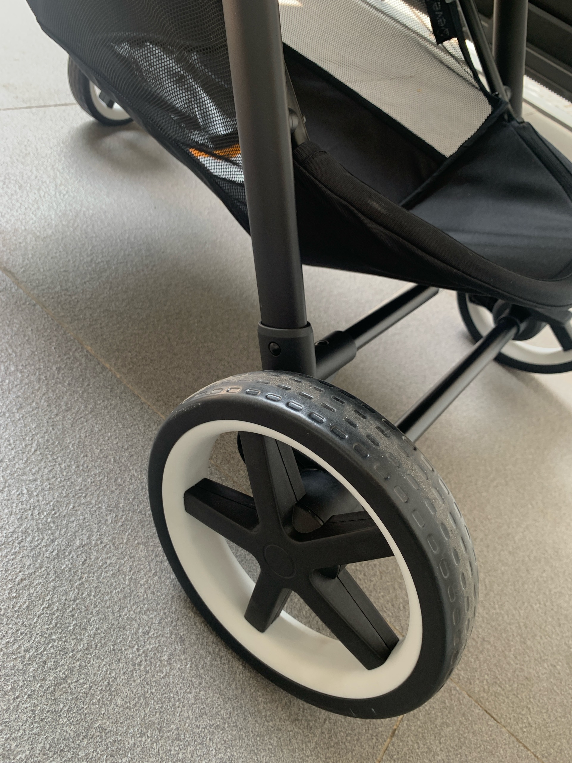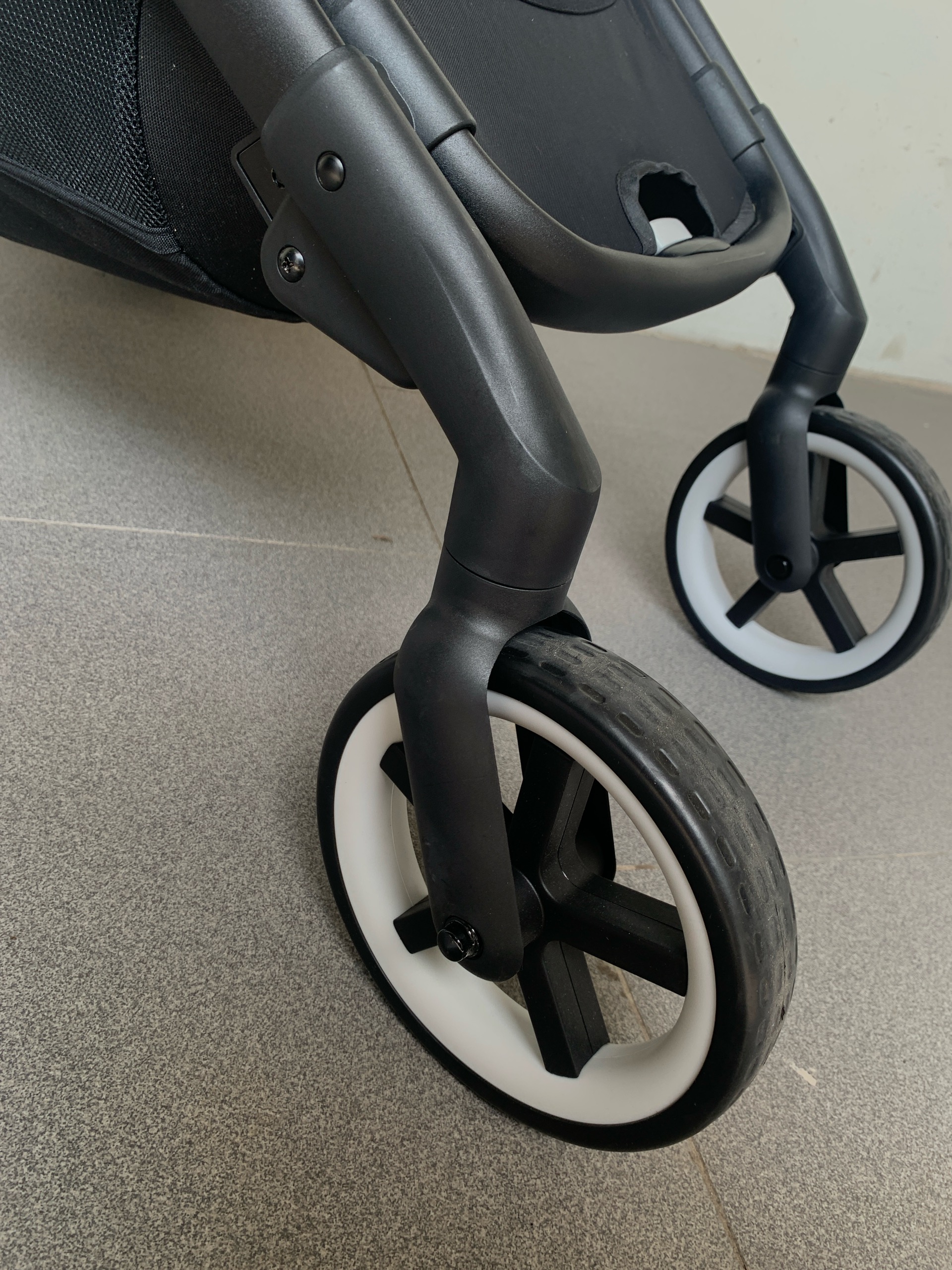 Tổng thế độ mới được đánh giá là >98%, xe còn khá mới dường như ko trầy xước, chỉ mới dùng 2 lần. Xe còn hoạt động tốt, chế độ gập và mối nối, khớp nối đều mượt. Các chế độ bung, gấp gọn, khoá bánh, bung gập mái, đóng mở đai an toàn, đảo chiều đều ổn định, phần đệm lót vải sạch đẹp, ko xù lông, ko rách, ko lỗi. Viền bọc đệm đai an toàn ở infant carseat bong da nhẹ do bảo quản nhưng ko ảnh hưởng đến tổng thể (ảnh có chỉ tay). Bánh xe ko hao mòn nhiều. Xe còn rất mới và đệm vải còn mới.