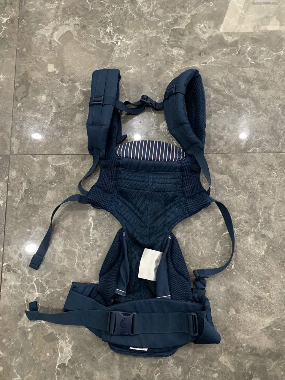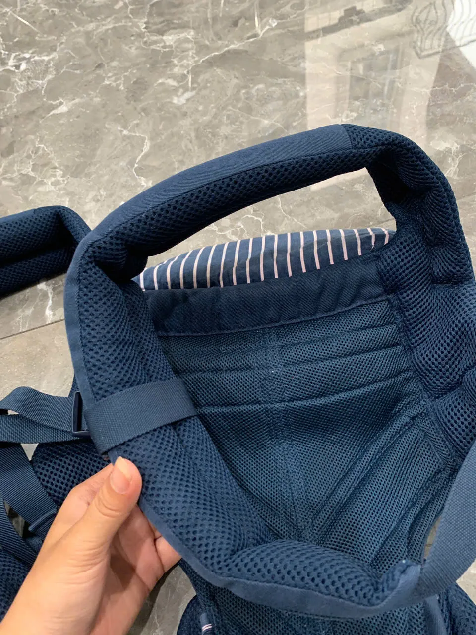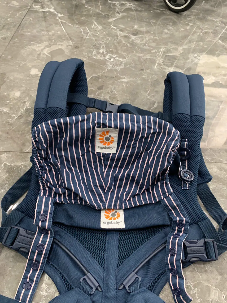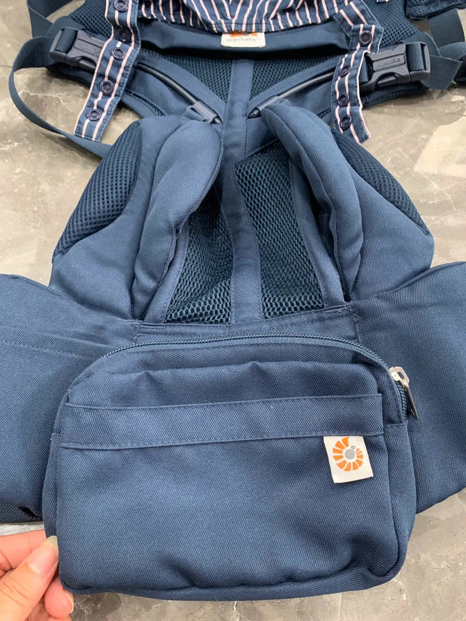 Địu Ergo baby Omni 360 cool air mesh màu xanh navy phối yếm sọc 0-4 tuổi tối đa 22kg