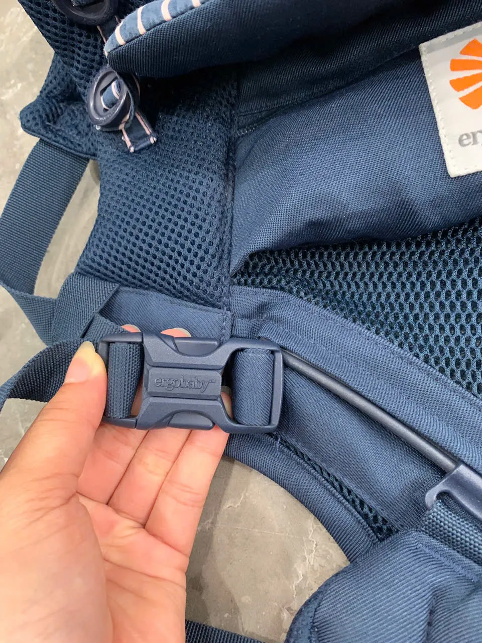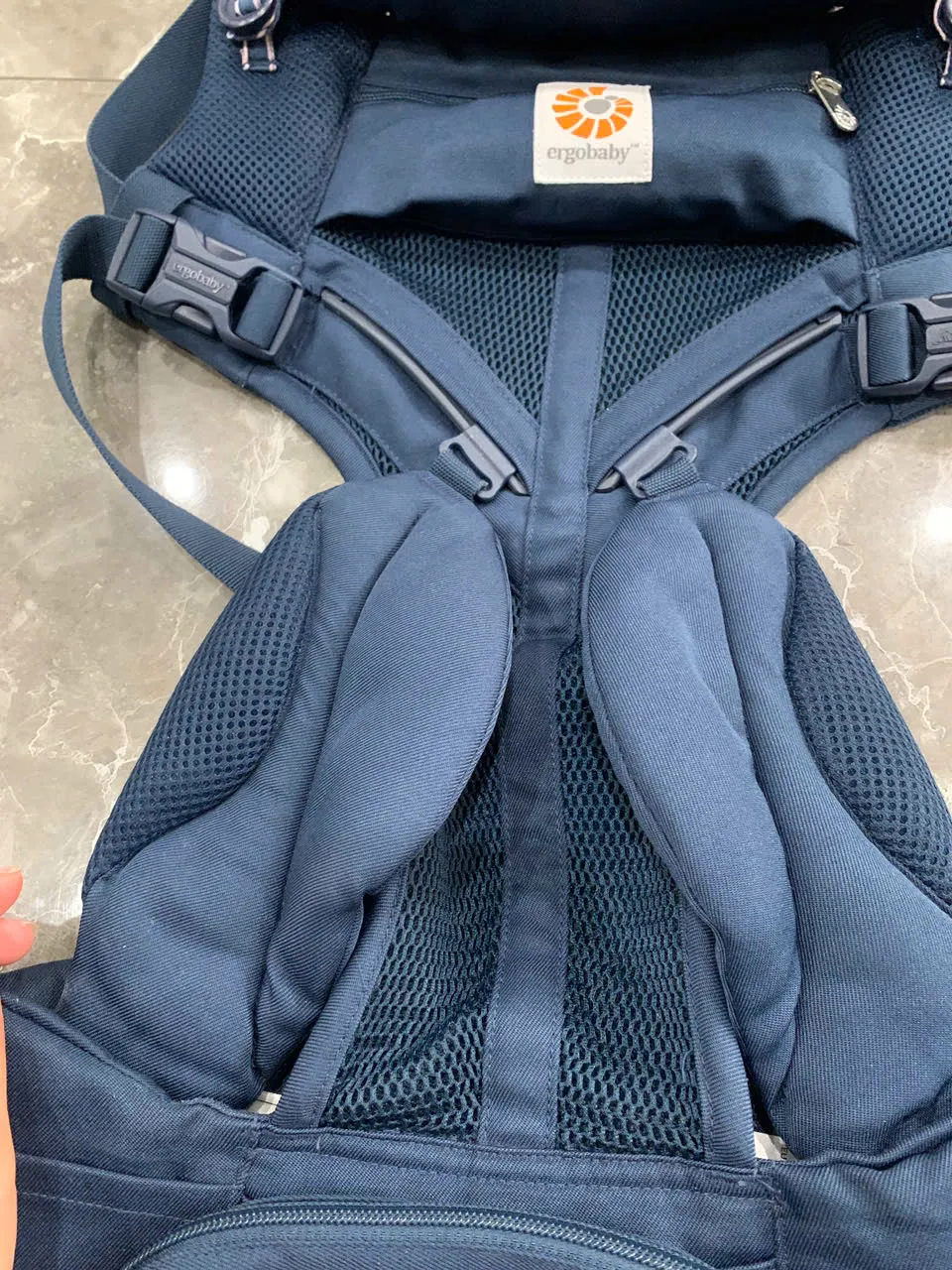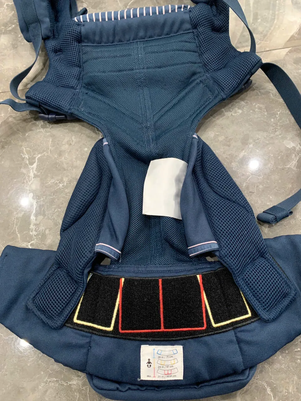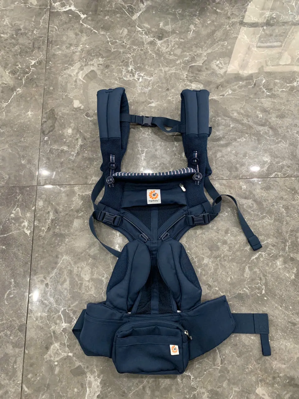 Địu Ergo baby Omni 360 cool air mesh màu xanh navy phối yếm sọc 0-4 tuổi tối đa 22kg