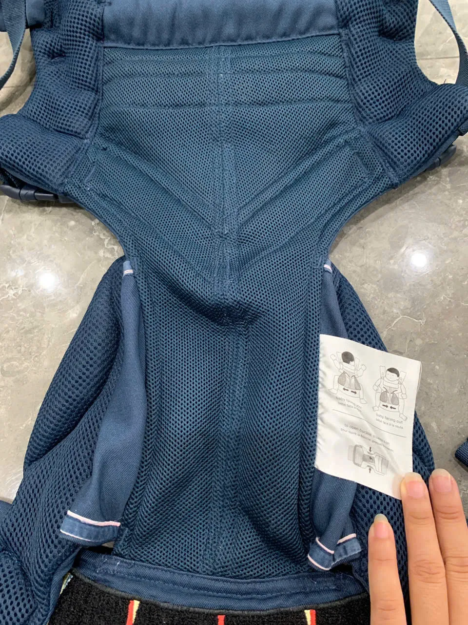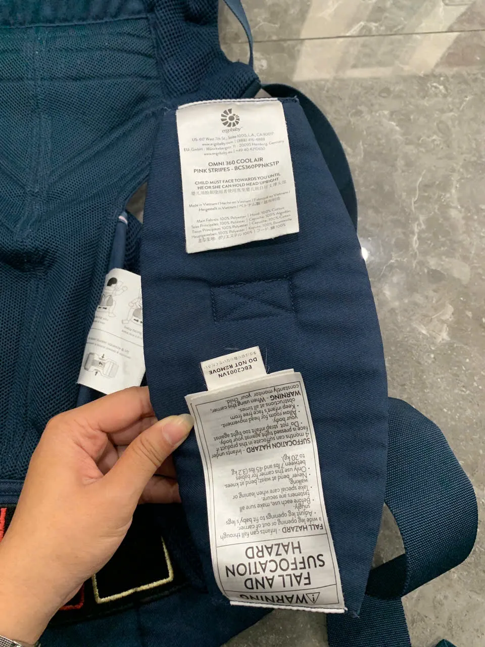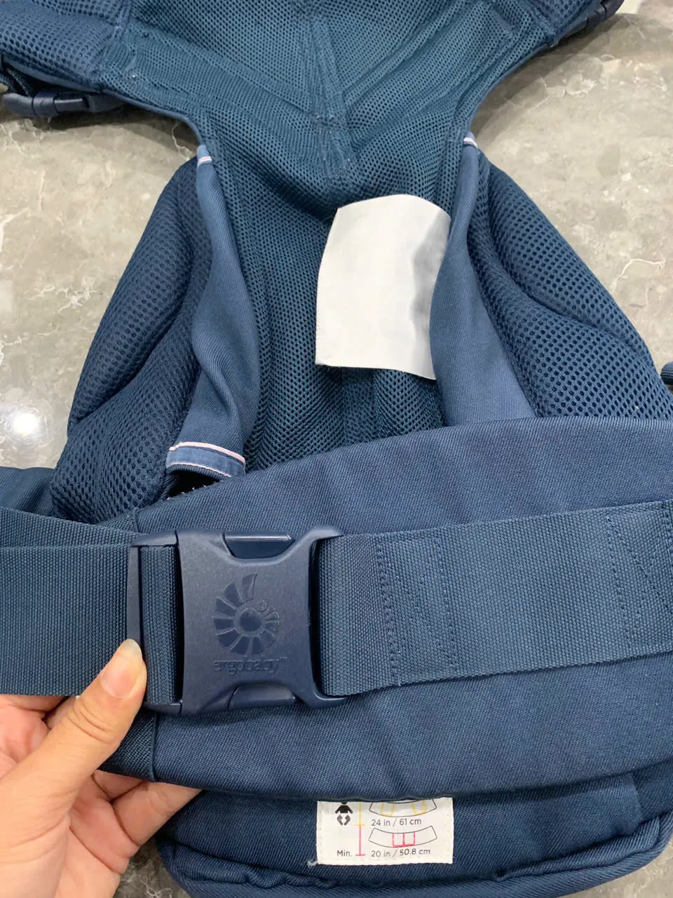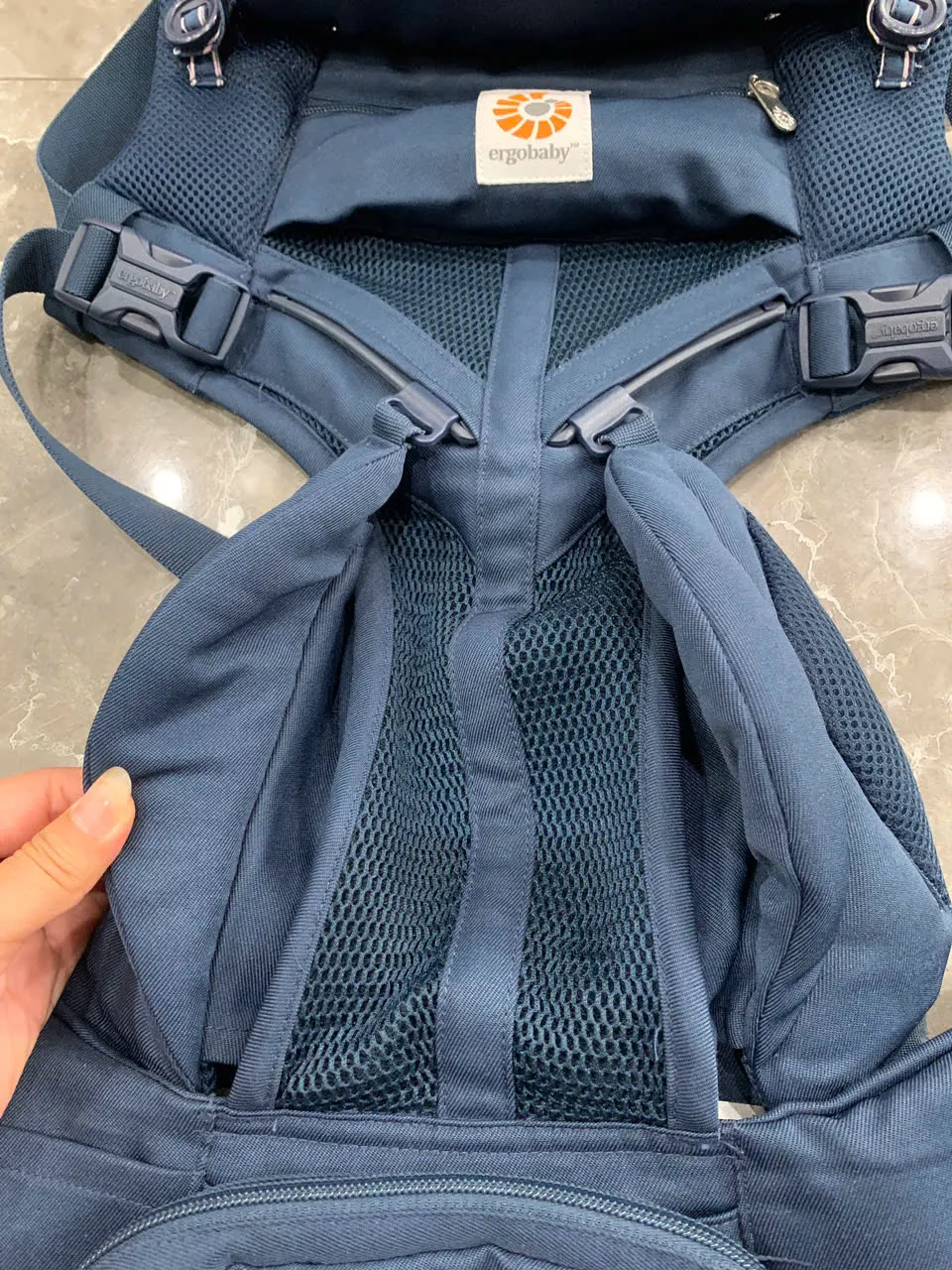 Địu Ergo baby Omni 360 cool air mesh màu xanh navy phối yếm sọc 0-4 tuổi tối đa 22kg