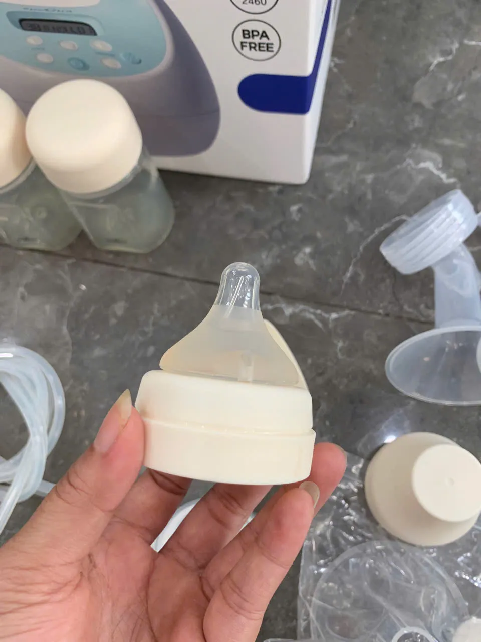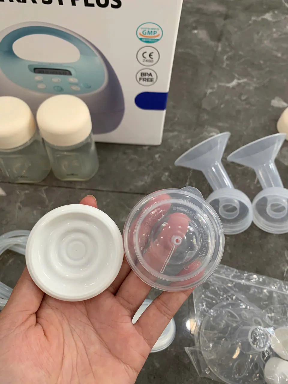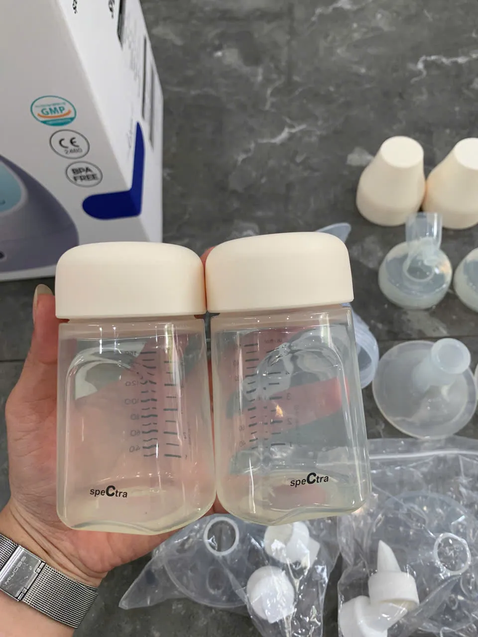 Tặng kèm 1 áo hút sữa và bộ bình Spectra (lưu ý: không bao gồm áo hút sữa hồng nhạt + bộ phễu Lacteck trong ảnh).