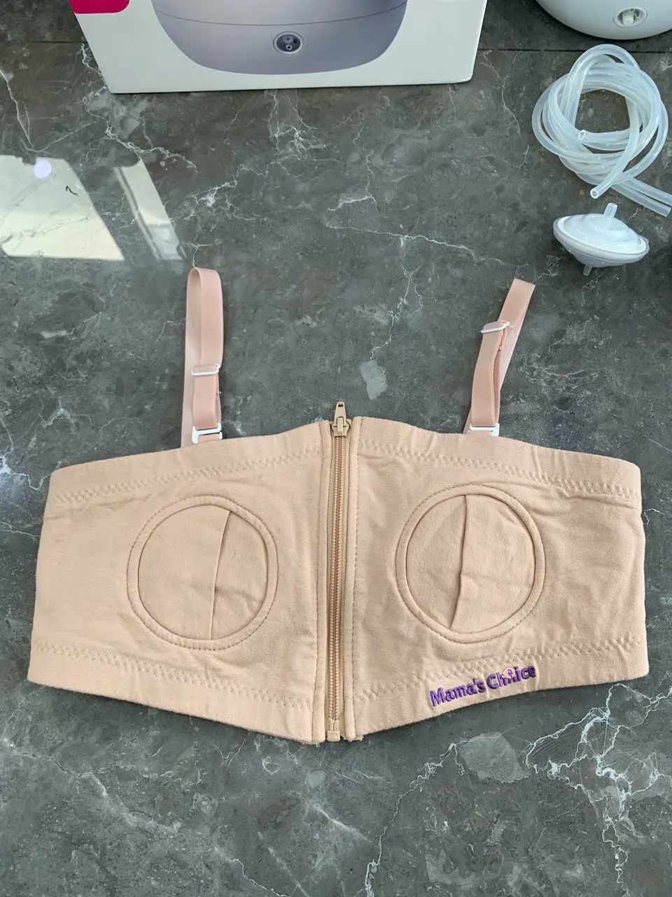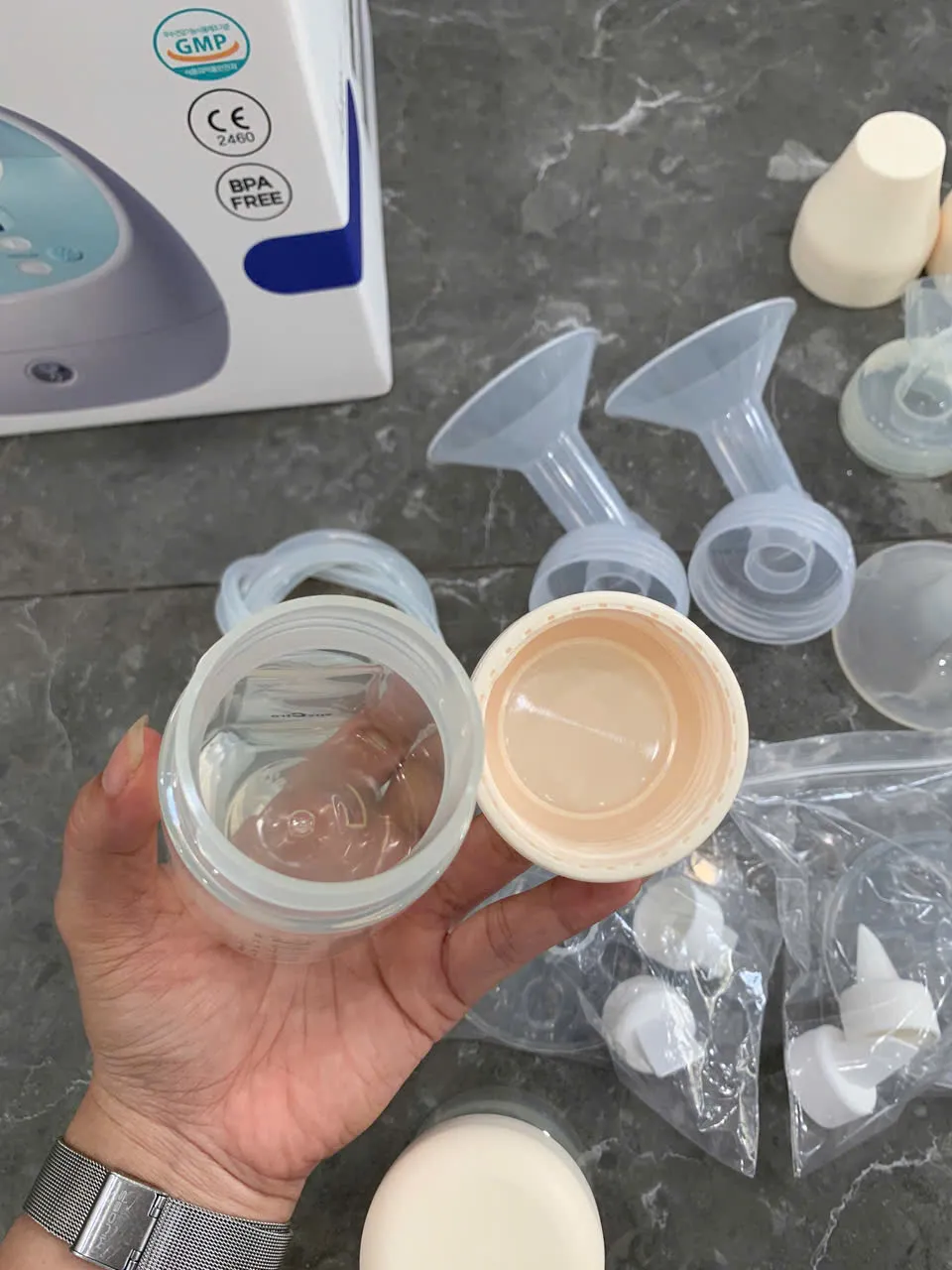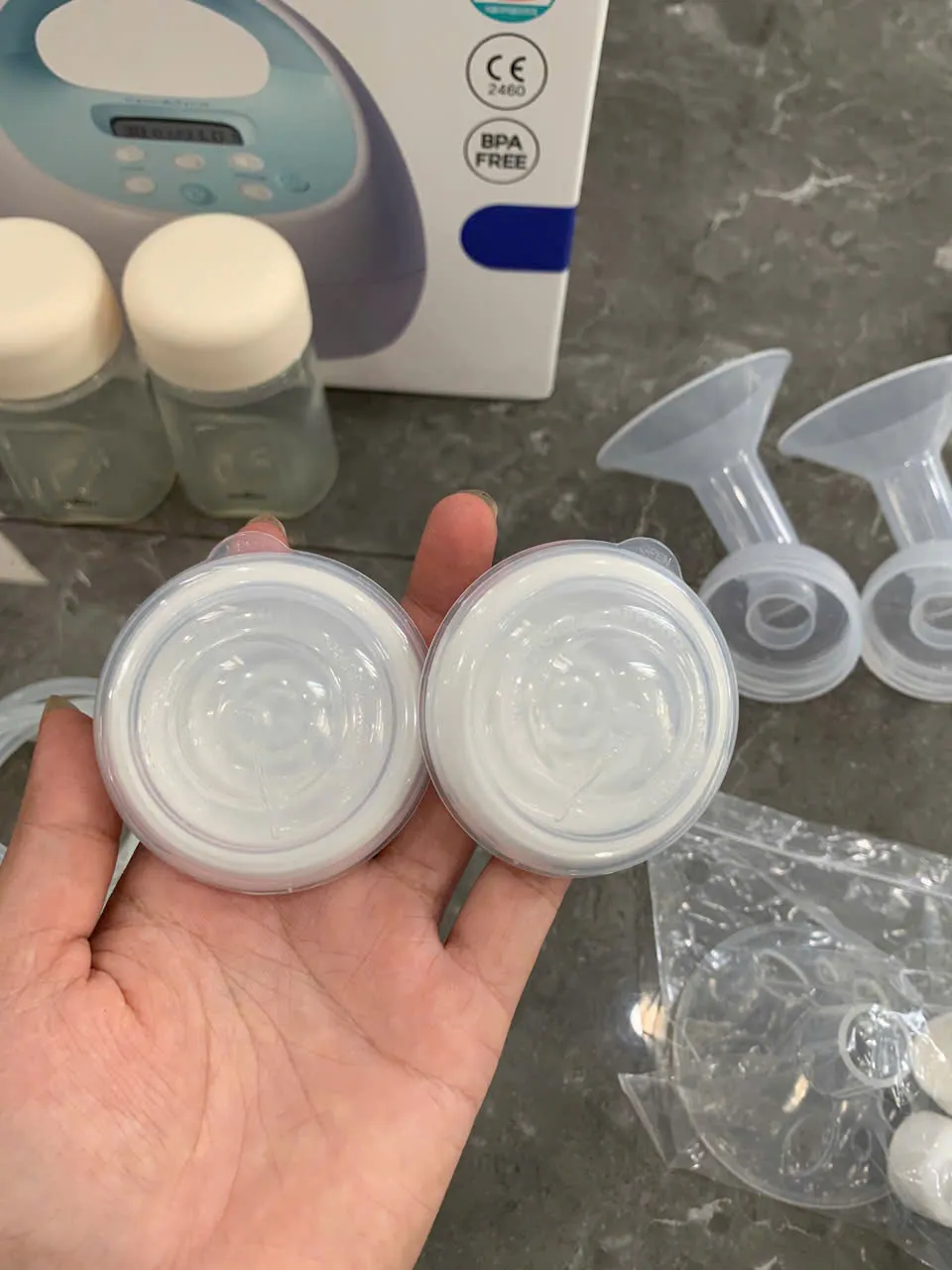 Tặng kèm 1 áo hút sữa và bộ bình Spectra (lưu ý: không bao gồm áo hút sữa hồng nhạt + bộ phễu Lacteck trong ảnh).
