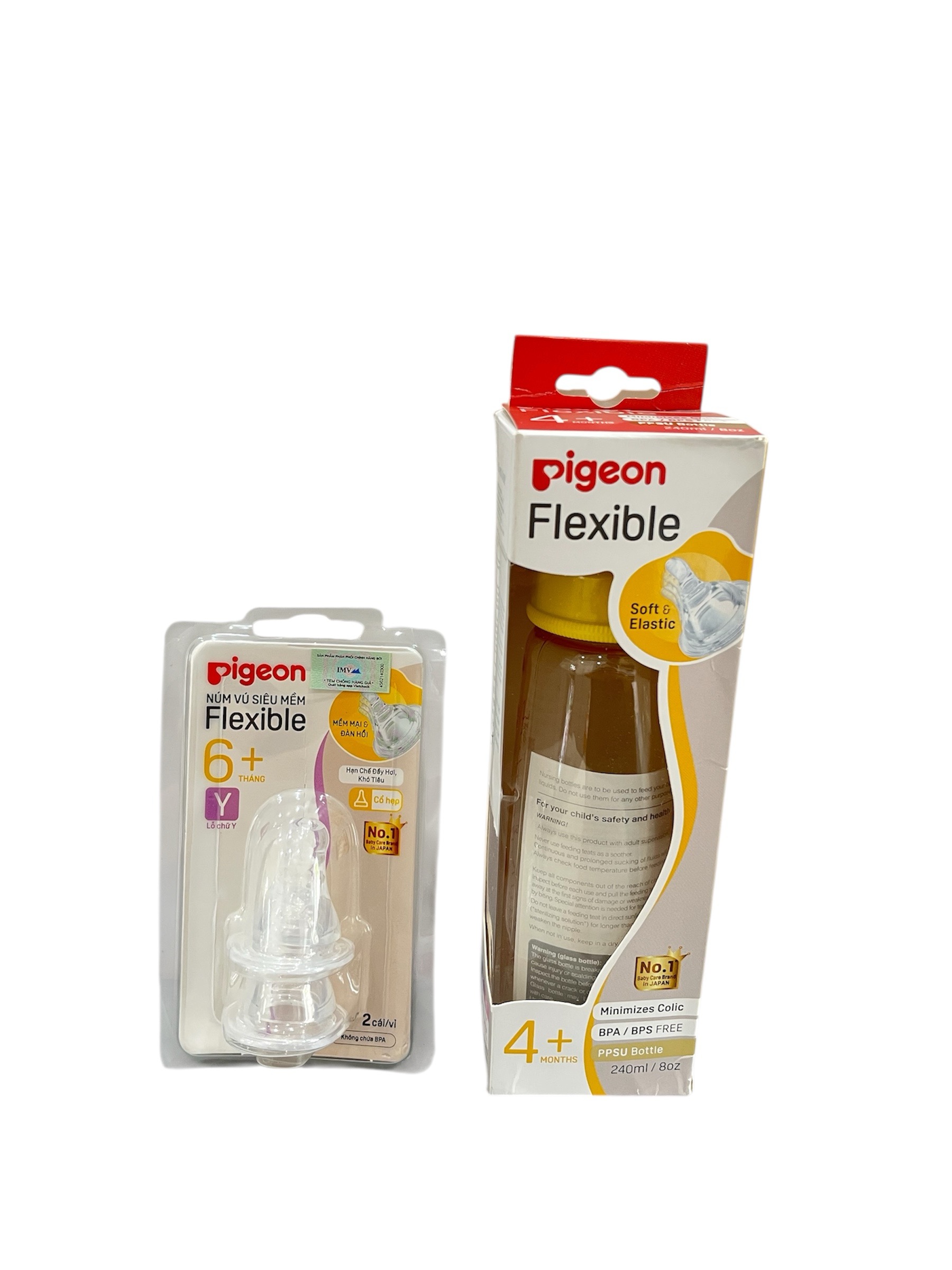 Set bình Sữa Pigeon flexible PPSU Cổ Hẹp 240ml (size núm: 4m+) & núm ti Pigeon thay thế (size: 6m+)