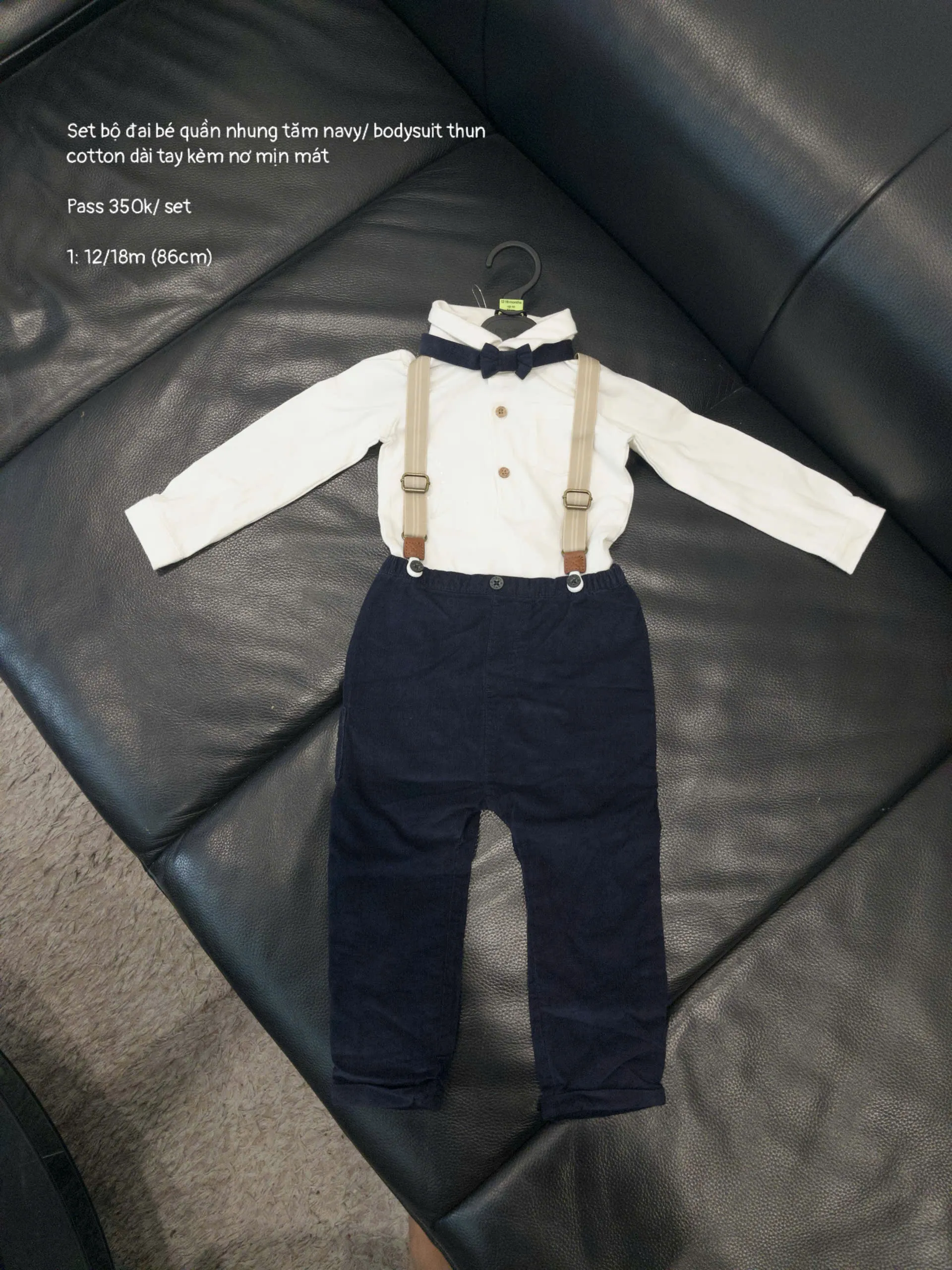 Set bộ sơ mi dài tay quần dài nhung tăm đai yếm Next baby (màu trắng/navy) kèm nơ ( size 12/18m)